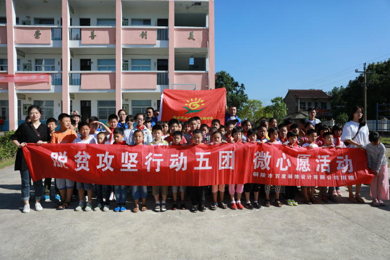 为了贯彻铜陵市民管局《关于深入推进社会组织参与脱贫攻坚行动的实施方案》的要求,更好的履行社会责任、发挥好各自团队的攻坚脱贫任务,铜陵市建筑装饰协会与阳光少年公益协会共同举办的第20期微心愿活动,于9月19日上午9点半在枞阳县白柳镇山河村山河小学举行!此次活动为山河小学的61名留守儿童和特殊困难家庭孩子发放微心愿物品。此次微心愿物品均由铜陵市百度装饰设计有限责任公司支持赞助 。