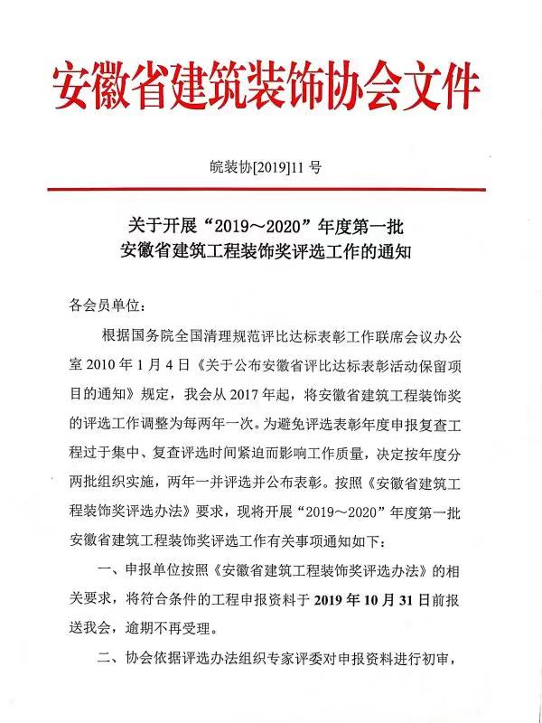 现将省建筑装饰协会皖装协(2019)11号文《关于开展“2019~2020”年度第一批安省建筑工程装饰奖评选工作》的通知特发给你们,请你们结合本单位施工验收完成的工程,对照安徽省建筑工程装饰奖评选规定,凡符合申报条件的工程,应积极组织专人整理资料,填写“审报表”按省装协规定时间之前,将相关资料申报到省装饰协会。