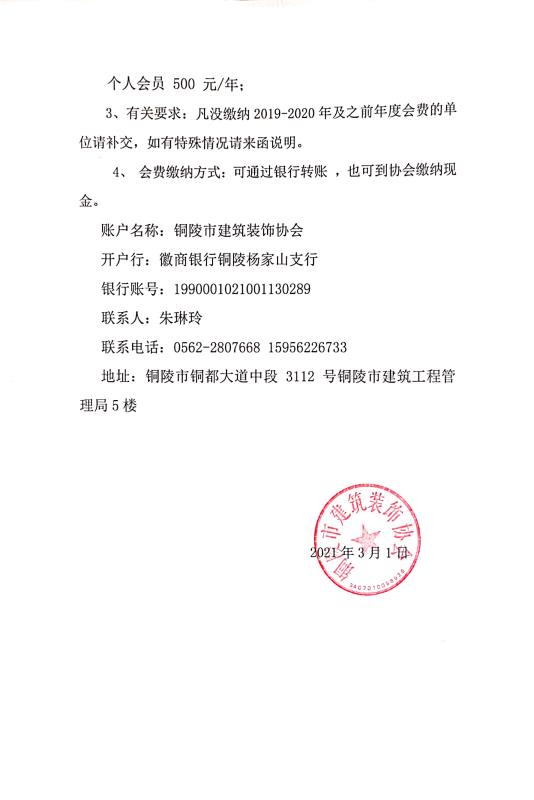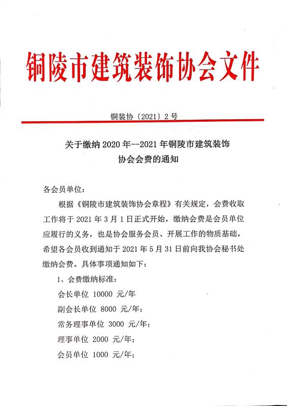 关于缴纳2020年-2021年铜陵市建筑装饰协会会费的通知
