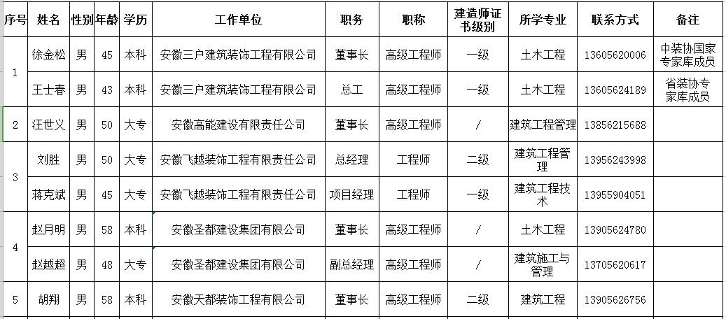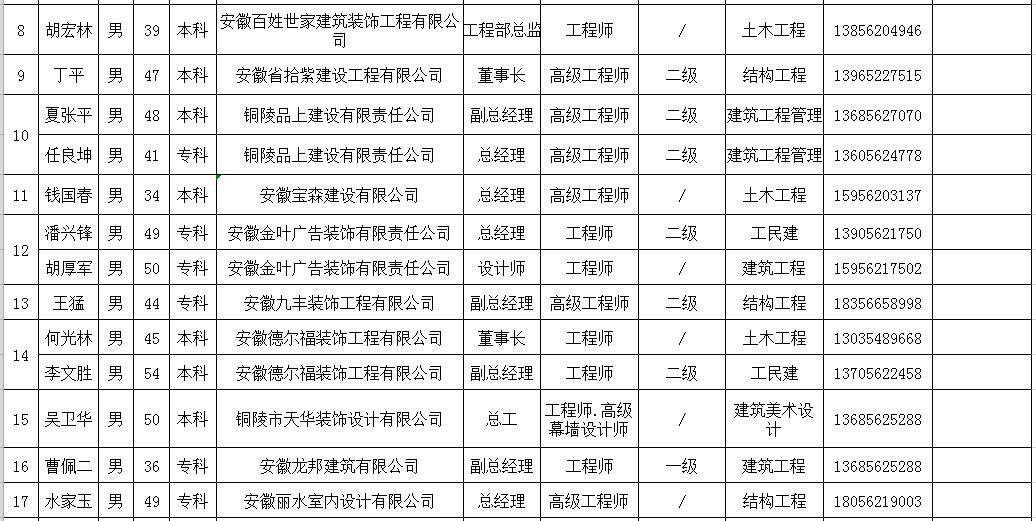 《铜陵市建筑装饰协会》拟推荐专家库成员汇总表