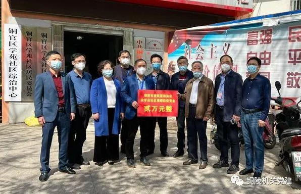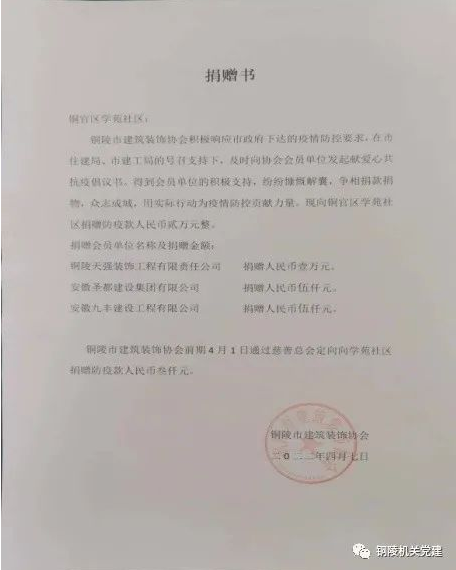 4月7日上午,经学苑社区临时党委协调,市建筑装饰协会携手铜陵天强装饰工程有限责任公司、安徽圣都建设集团有限公司、安徽九丰建设工程有限公司等爱心企业向学苑社区捐赠防疫资金贰万元,助力打赢疫情防控阻击战。