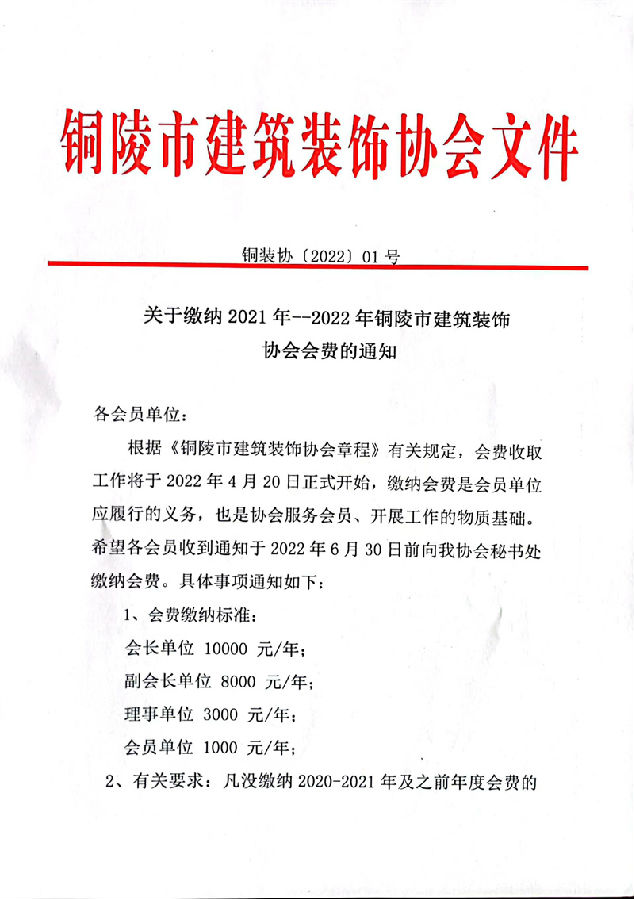 关于缴纳2021年--2022年铜陵市建筑装饰协会会费的通知