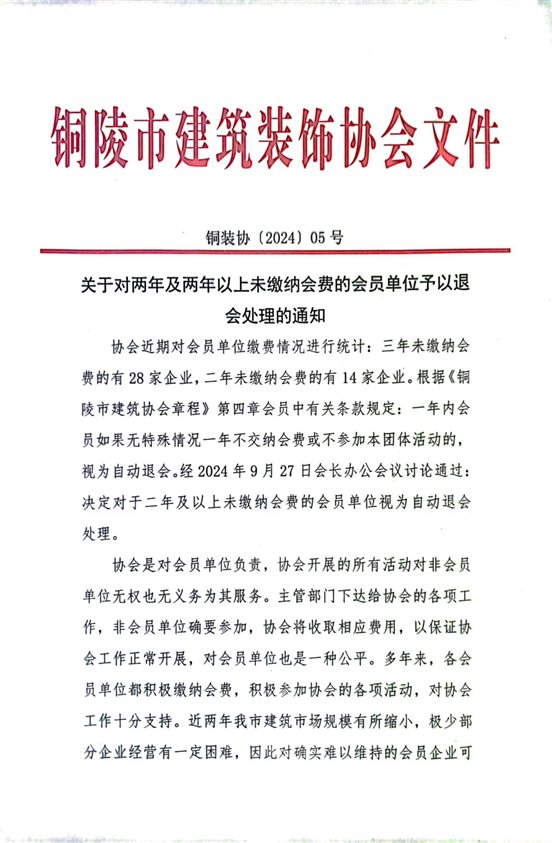 关于对两年及两年以上未缴纳会费的会员单位予以退会处理的通知