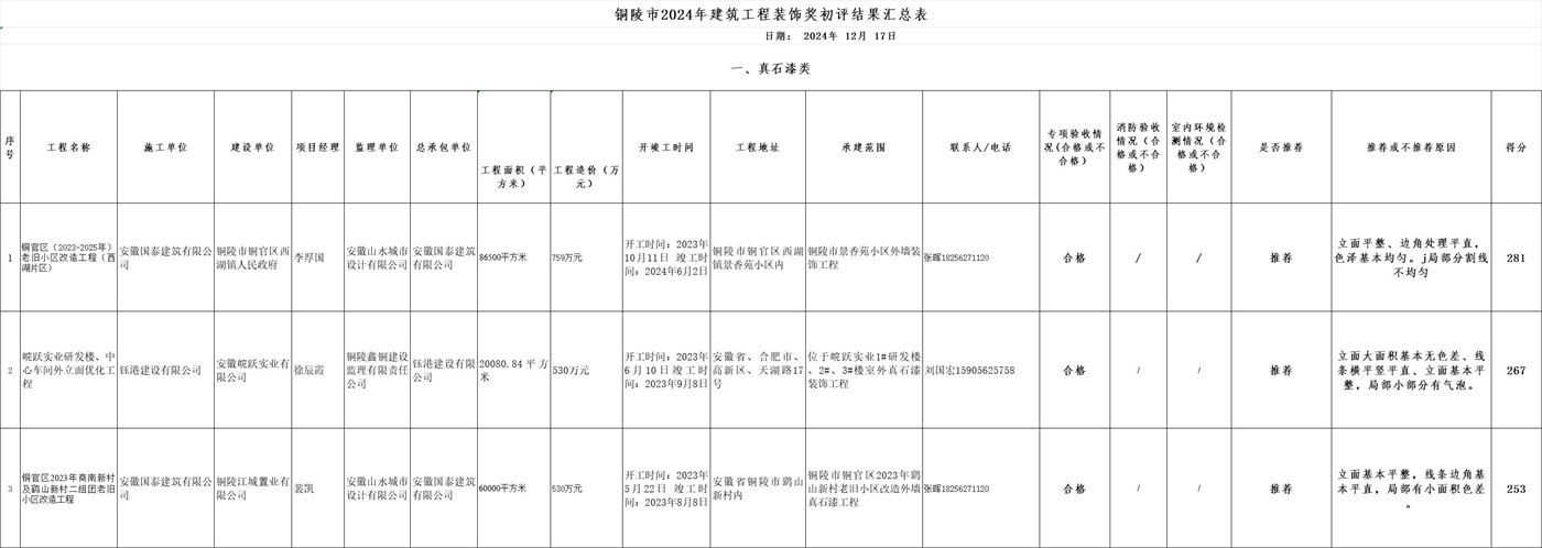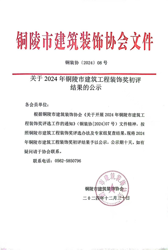 上一篇:关于公布铜陵市2024年度优良工程和建筑工程“装饰奖”获奖项目的通知
