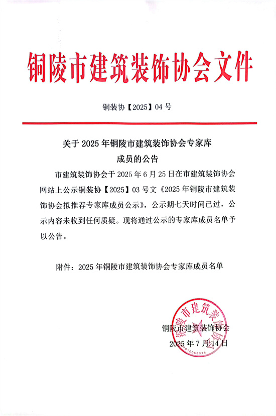 关于2025年铜陵市建筑装饰协会专家库成员的公告